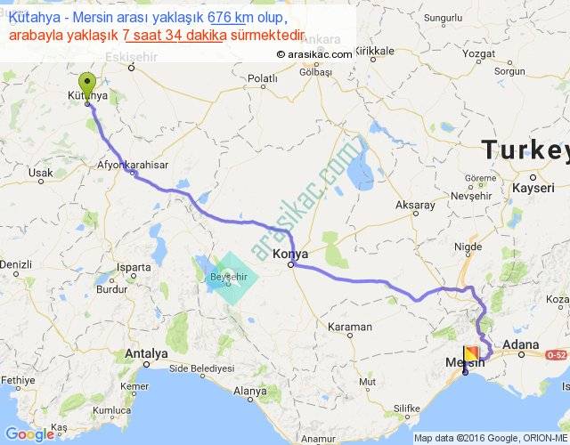 Kütahya - Mersin arası yaklaşık olarak 90 km/h ile yukarıda belirtilen sürede olup, iki yerin kuş uçuşu uzaklığı (mesafesi) 497'dir. Eğer belirtilen yerler arasında uçak seferi var ise bu süre uçakla 45 dakika'ya kadar düşebilir. Yolculuk otobüsle 9 saat 50 dakika sürmektedir.