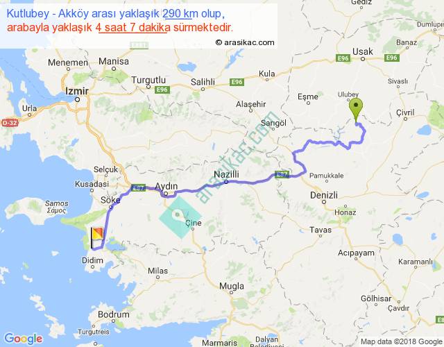 Kutlubey - Akköy arası yaklaşık olarak 90 km/h ile yukarıda belirtilen sürede olup, iki yerin kuş uçuşu uzaklığı (mesafesi) 202'dir. Yolculuk otobüsle 5 saat 21 dakika sürmektedir.