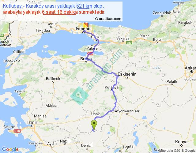 Kutlubey - Karaköy arası yaklaşık olarak 90 km/h ile yukarıda belirtilen sürede olup, iki yerin kuş uçuşu uzaklığı (mesafesi) 305'dir. Eğer belirtilen yerler arasında uçak seferi var ise bu süre uçakla 28 dakika'ya kadar düşebilir. Yolculuk otobüsle 8 saat 8 dakika sürmektedir.