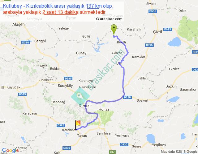 Kutlubey - Kızılcabölük arası yaklaşık olarak 90 km/h ile yukarıda belirtilen sürede olup, iki yerin kuş uçuşu uzaklığı (mesafesi) 79'dir. Yolculuk otobüsle 2 saat 52 dakika sürmektedir.