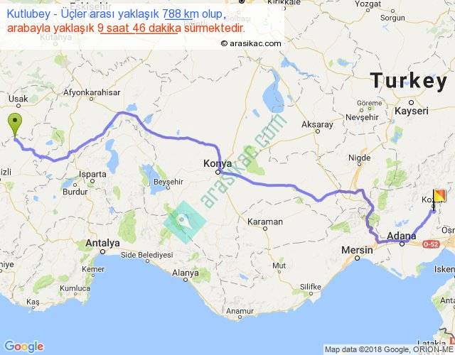 Kutlubey - Üçler arası yaklaşık olarak 90 km/h ile yukarıda belirtilen sürede olup, iki yerin kuş uçuşu uzaklığı (mesafesi) 575'dir. Eğer belirtilen yerler arasında uçak seferi var ise bu süre uçakla 53 dakika'ya kadar düşebilir. Yolculuk otobüsle 12 saat 41 dakika sürmektedir.