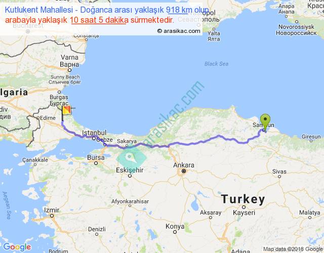 Kutlukent Mahallesi - Doğanca arası yaklaşık olarak 90 km/h ile yukarıda belirtilen sürede olup, iki yerin kuş uçuşu uzaklığı (mesafesi) 730'dir. Eğer belirtilen yerler arasında uçak seferi var ise bu süre uçakla 1 saat 07 dakika'ya kadar düşebilir. Yolculuk otobüsle 13 saat 6 dakika sürmektedir.