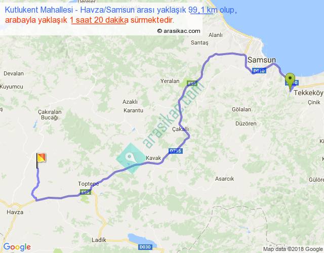 Kutlukent Mahallesi - Havza Samsun arası yaklaşık olarak 90 km/h ile yukarıda belirtilen sürede olup, iki yerin kuş uçuşu uzaklığı (mesafesi) 60'dir. Yolculuk otobüsle 1 saat 44 dakika sürmektedir.