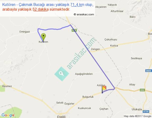 Kutören - Çakmak Bucağı arası yaklaşık olarak 90 km/h ile yukarıda belirtilen sürede olup, iki yerin kuş uçuşu uzaklığı (mesafesi) 40'dir. Yolculuk otobüsle 1 saat 7 dakika sürmektedir.