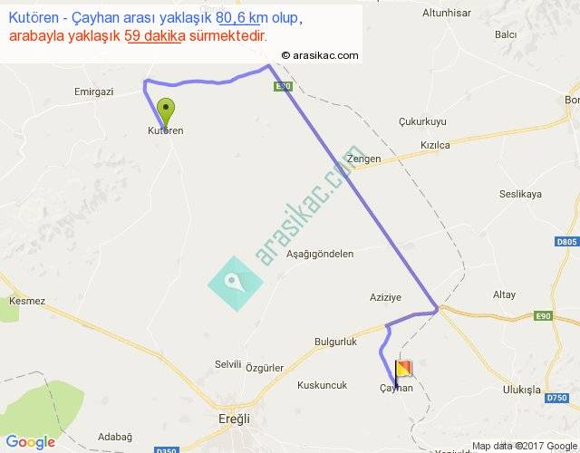 Kutören - Çayhan arası yaklaşık olarak 90 km/h ile yukarıda belirtilen sürede olup, iki yerin kuş uçuşu uzaklığı (mesafesi) 46'dir. Yolculuk otobüsle 1 saat 16 dakika sürmektedir.