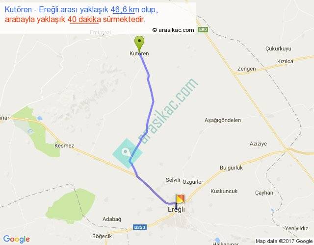 Kutören - Ereğli arası yaklaşık olarak 90 km/h ile yukarıda belirtilen sürede olup, iki yerin kuş uçuşu uzaklığı (mesafesi) 435'dir. Eğer belirtilen yerler arasında uçak seferi var ise bu süre uçakla 40 dakika'ya kadar düşebilir. Yolculuk otobüsle 8 saat 36 dakika sürmektedir.