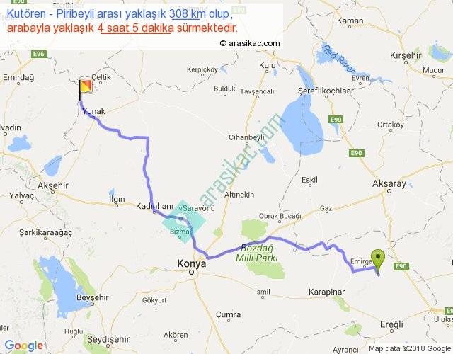 Kutören - Piribeyli arası yaklaşık olarak 90 km/h ile yukarıda belirtilen sürede olup, iki yerin kuş uçuşu uzaklığı (mesafesi) 231'dir. Yolculuk otobüsle 5 saat 18 dakika sürmektedir.