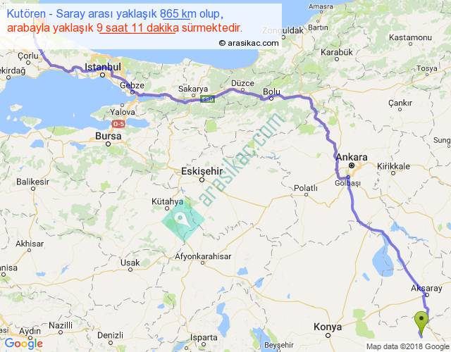 Kutören - Saray arası yaklaşık olarak 90 km/h ile yukarıda belirtilen sürede olup, iki yerin kuş uçuşu uzaklığı (mesafesi) 648'dir. Eğer belirtilen yerler arasında uçak seferi var ise bu süre uçakla 59 dakika'ya kadar düşebilir. Yolculuk otobüsle 11 saat 56 dakika sürmektedir.