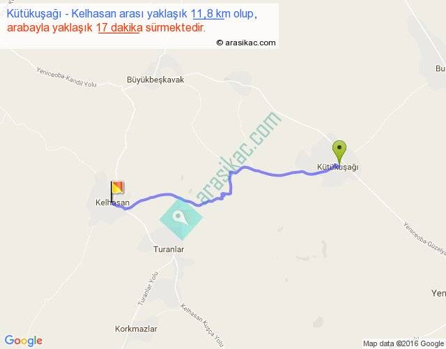 Kütükuşağı - Kelhasan arası yaklaşık olarak 90 km/h ile yukarıda belirtilen sürede olup, iki yerin kuş uçuşu uzaklığı (mesafesi) 10'dir. Yolculuk otobüsle 22 dakika sürmektedir.