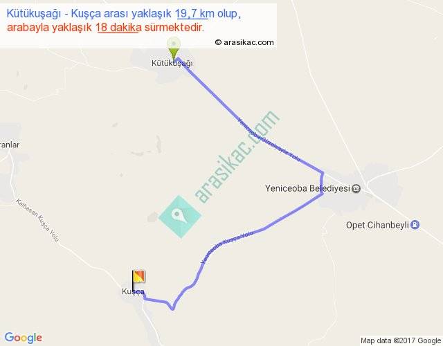 Kütükuşağı - Kuşça arası yaklaşık olarak 90 km/h ile yukarıda belirtilen sürede olup, iki yerin kuş uçuşu uzaklığı (mesafesi) 10'dir. Yolculuk otobüsle 23 dakika sürmektedir.