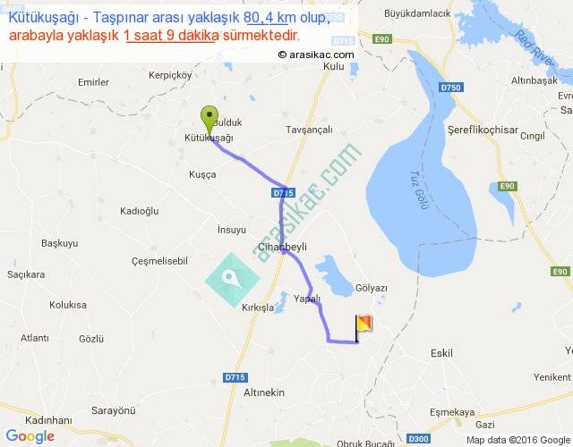 Kütükuşağı - Taşpınar arası yaklaşık olarak 90 km/h ile yukarıda belirtilen sürede olup, iki yerin kuş uçuşu uzaklığı (mesafesi) 67'dir. Yolculuk otobüsle 1 saat 29 dakika sürmektedir.