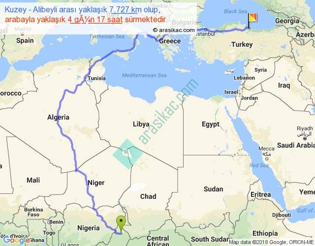Kuzey - Alibeyli arası yaklaşık olarak 90 km/h ile yukarıda belirtilen sürede olup, iki yerin kuş uçuşu uzaklığı (mesafesi) 4244'dir. Eğer belirtilen yerler arasında uçak seferi var ise bu süre uçakla 6 saat 31 dakika'ya kadar düşebilir. Yolculuk otobüsle 6 gün 2 saat sürmektedir.