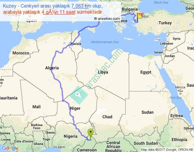 Kuzey - Cenkyeri arası yaklaşık olarak 90 km/h ile yukarıda belirtilen sürede olup, iki yerin kuş uçuşu uzaklığı (mesafesi) 3641'dir. Eğer belirtilen yerler arasında uçak seferi var ise bu süre uçakla 5 saat 36 dakika'ya kadar düşebilir. Yolculuk otobüsle 5 gün 19 saat sürmektedir.