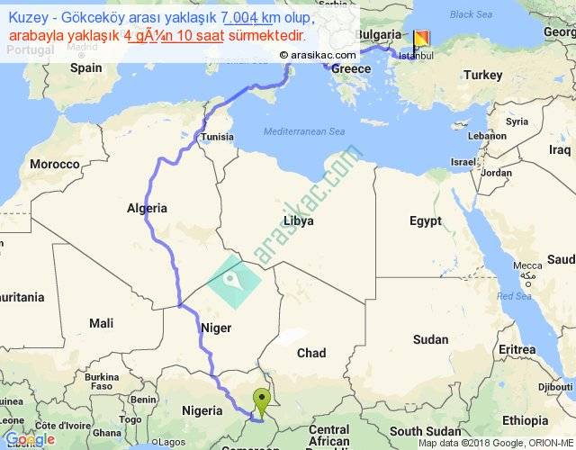 Kuzey - Gökceköy arası yaklaşık olarak 90 km/h ile yukarıda belirtilen sürede olup, iki yerin kuş uçuşu uzaklığı (mesafesi) 3799'dir. Eğer belirtilen yerler arasında uçak seferi var ise bu süre uçakla 5 saat 50 dakika'ya kadar düşebilir. Yolculuk otobüsle 5 gün 17 saat sürmektedir.