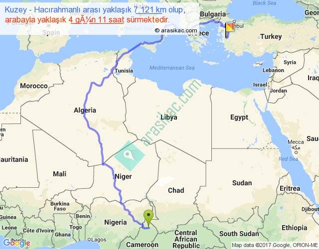 Kuzey - Hacırahmanlı arası yaklaşık olarak 90 km/h ile yukarıda belirtilen sürede olup, iki yerin kuş uçuşu uzaklığı (mesafesi) 3605'dir. Eğer belirtilen yerler arasında uçak seferi var ise bu süre uçakla 5 saat 32 dakika'ya kadar düşebilir. Yolculuk otobüsle 5 gün 19 saat sürmektedir.