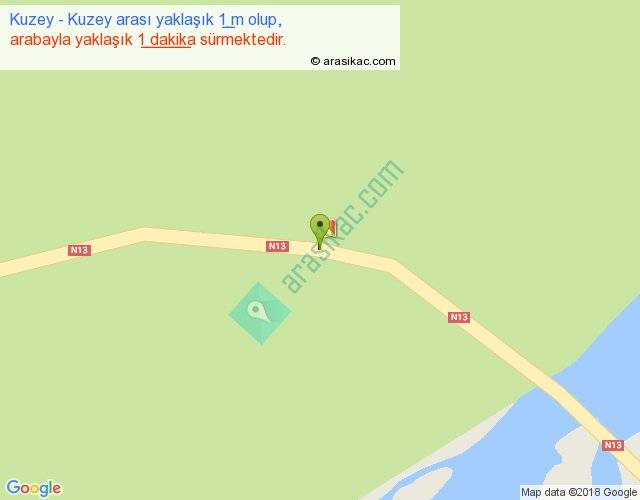 Kuzey - Kuzey arası yaklaşık olarak 90 km/h ile yukarıda belirtilen sürede olup, iki yerin kuş uçuşu uzaklığı (mesafesi) 0'dir. Yolculuk otobüsle 1 dakika sürmektedir.