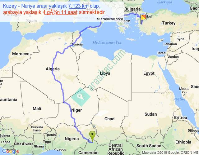 Kuzey - Nuriye arası yaklaşık olarak 90 km/h ile yukarıda belirtilen sürede olup, iki yerin kuş uçuşu uzaklığı (mesafesi) 3610'dir. Eğer belirtilen yerler arasında uçak seferi var ise bu süre uçakla 5 saat 33 dakika'ya kadar düşebilir. Yolculuk otobüsle 5 gün 19 saat sürmektedir.