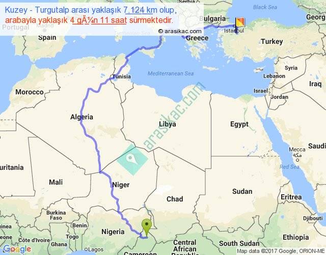 Kuzey - Turgutalp arası yaklaşık olarak 90 km/h ile yukarıda belirtilen sürede olup, iki yerin kuş uçuşu uzaklığı (mesafesi) 3801'dir. Eğer belirtilen yerler arasında uçak seferi var ise bu süre uçakla 5 saat 50 dakika'ya kadar düşebilir. Yolculuk otobüsle 5 gün 19 saat sürmektedir.