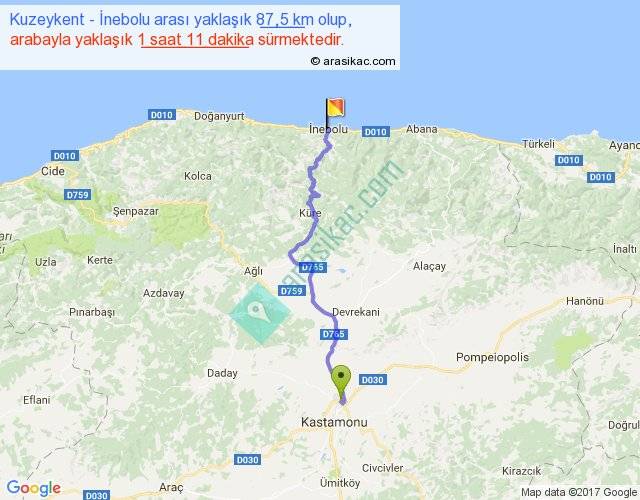 Kuzeykent - İnebolu arası yaklaşık olarak 90 km/h ile yukarıda belirtilen sürede olup, iki yerin kuş uçuşu uzaklığı (mesafesi) 62'dir. Yolculuk otobüsle 1 saat 32 dakika sürmektedir.
