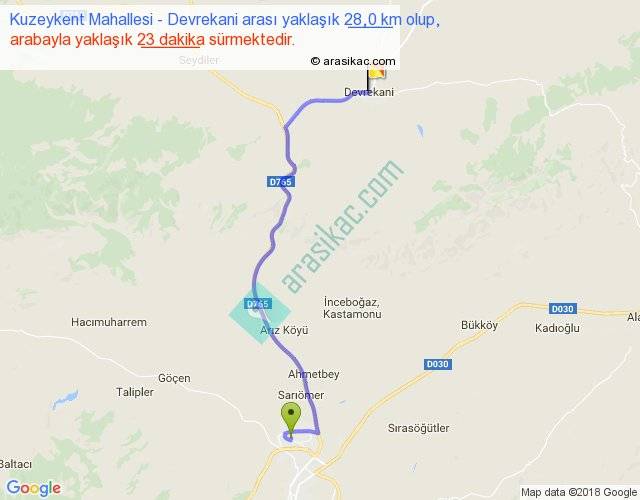 Kuzeykent Mahallesi - Devrekani arası yaklaşık olarak 90 km/h ile yukarıda belirtilen sürede olup, iki yerin kuş uçuşu uzaklığı (mesafesi) 20'dir. Yolculuk otobüsle 29 dakika sürmektedir.
