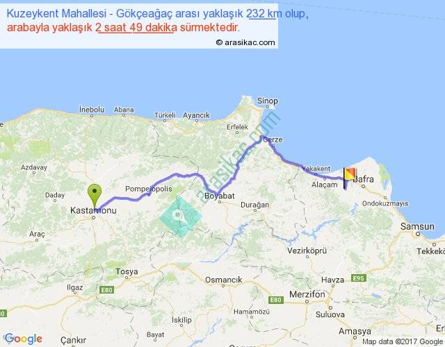 Kuzeykent Mahallesi - Gökçeağaç arası yaklaşık olarak 90 km/h ile yukarıda belirtilen sürede olup, iki yerin kuş uçuşu uzaklığı (mesafesi) 165'dir. Yolculuk otobüsle 3 saat 39 dakika sürmektedir.