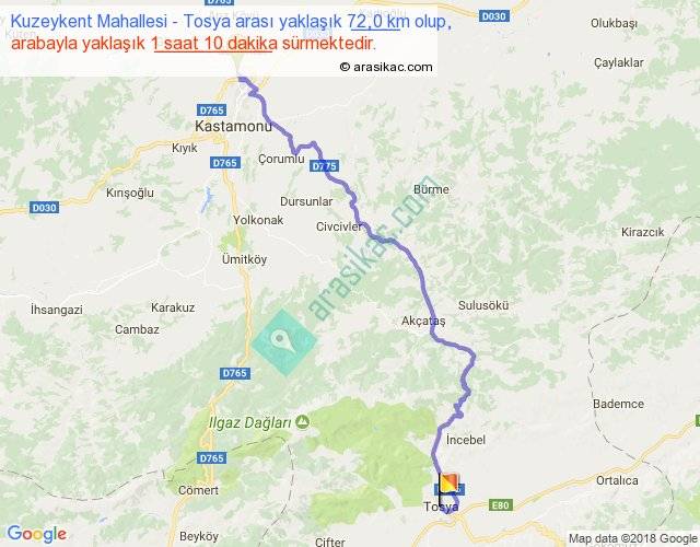 Kuzeykent Mahallesi - Tosya arası yaklaşık olarak 90 km/h ile yukarıda belirtilen sürede olup, iki yerin kuş uçuşu uzaklığı (mesafesi) 50'dir. Yolculuk otobüsle 1 saat 31 dakika sürmektedir.