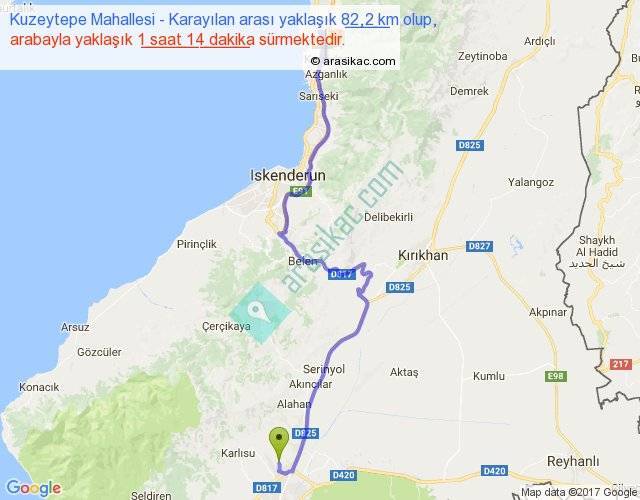 Kuzeytepe Mahallesi - Karayılan arası yaklaşık olarak 90 km/h ile yukarıda belirtilen sürede olup, iki yerin kuş uçuşu uzaklığı (mesafesi) 50'dir. Yolculuk otobüsle 1 saat 36 dakika sürmektedir.