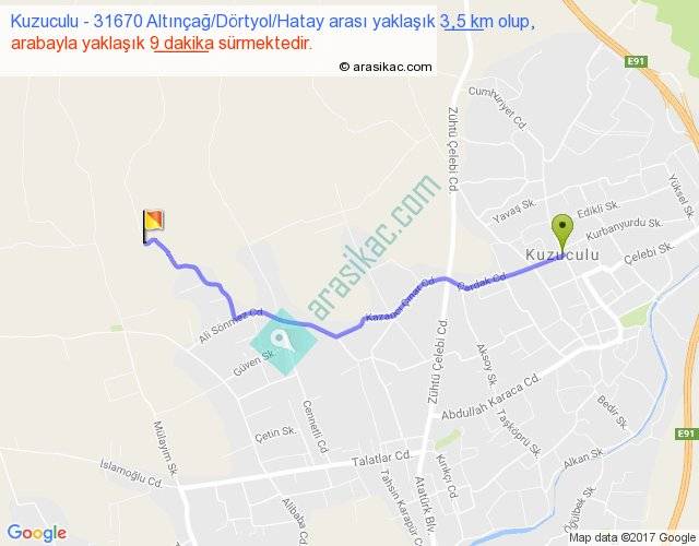 Kuzuculu - 31670 Altınçağ Dörtyol Hatay arası yaklaşık olarak 90 km/h ile yukarıda belirtilen sürede olup, iki yerin kuş uçuşu uzaklığı (mesafesi) 3'dir. Yolculuk otobüsle 11 dakika sürmektedir.