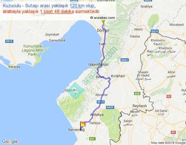Kuzuculu - Sutaşı arası yaklaşık olarak 90 km/h ile yukarıda belirtilen sürede olup, iki yerin kuş uçuşu uzaklığı (mesafesi) 91'dir. Yolculuk otobüsle 2 saat 20 dakika sürmektedir.