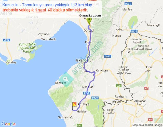 Kuzuculu - Tomruksuyu arası yaklaşık olarak 90 km/h ile yukarıda belirtilen sürede olup, iki yerin kuş uçuşu uzaklığı (mesafesi) 82'dir. Yolculuk otobüsle 2 saat 10 dakika sürmektedir.