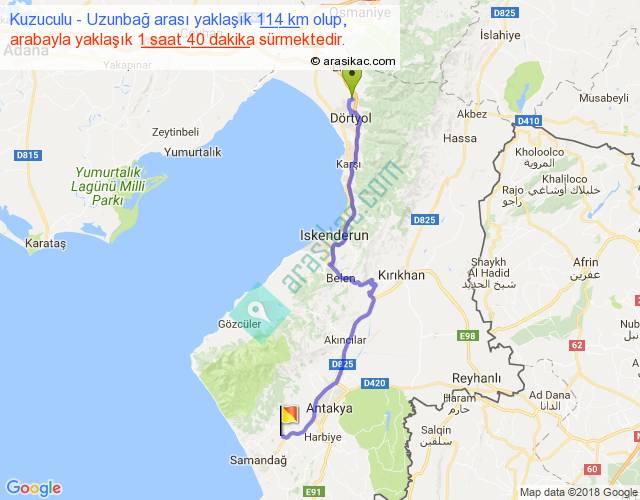 Kuzuculu - Uzunbağ arası yaklaşık olarak 90 km/h ile yukarıda belirtilen sürede olup, iki yerin kuş uçuşu uzaklığı (mesafesi) 84'dir. Yolculuk otobüsle 2 saat 10 dakika sürmektedir.