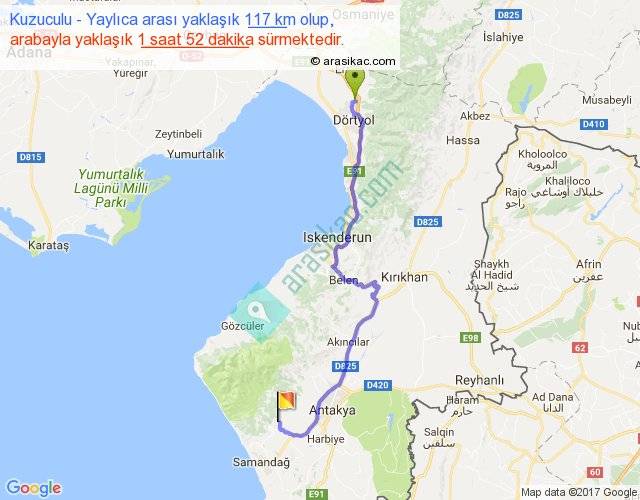 Kuzuculu - Yaylıca arası yaklaşık olarak 90 km/h ile yukarıda belirtilen sürede olup, iki yerin kuş uçuşu uzaklığı (mesafesi) 81'dir. Yolculuk otobüsle 2 saat 25 dakika sürmektedir.