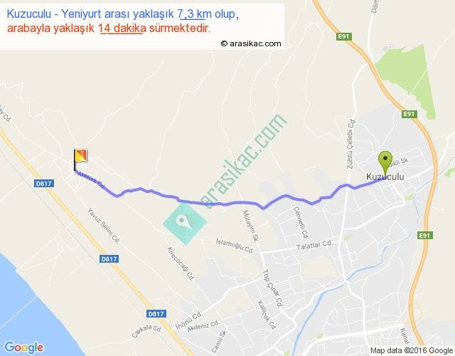 Kuzuculu - Yeniyurt arası yaklaşık olarak 90 km/h ile yukarıda belirtilen sürede olup, iki yerin kuş uçuşu uzaklığı (mesafesi) 7'dir. Yolculuk otobüsle 18 dakika sürmektedir.