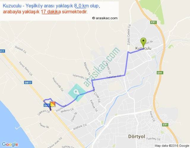 Kuzuculu - Yeşilköy arası yaklaşık olarak 90 km/h ile yukarıda belirtilen sürede olup, iki yerin kuş uçuşu uzaklığı (mesafesi) 6'dir. Yolculuk otobüsle 22 dakika sürmektedir.
