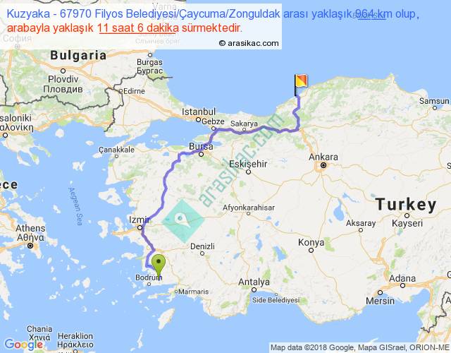 Kuzyaka - 67970 Filyos Belediyesi Çaycuma Zonguldak arası yaklaşık olarak 90 km/h ile yukarıda belirtilen sürede olup, iki yerin kuş uçuşu uzaklığı (mesafesi) 610'dir. Eğer belirtilen yerler arasında uçak seferi var ise bu süre uçakla 56 dakika'ya kadar düşebilir. Yolculuk otobüsle 14 saat 25 dakika sürmektedir.