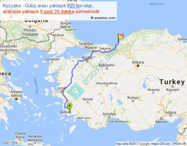 Kuzyaka - Gülüç arası yaklaşık olarak 90 km/h ile yukarıda belirtilen sürede olup, iki yerin kuş uçuşu uzaklığı (mesafesi) 554'dir. Eğer belirtilen yerler arasında uçak seferi var ise bu süre uçakla 51 dakika'ya kadar düşebilir. Yolculuk otobüsle 12 saat 32 dakika sürmektedir.