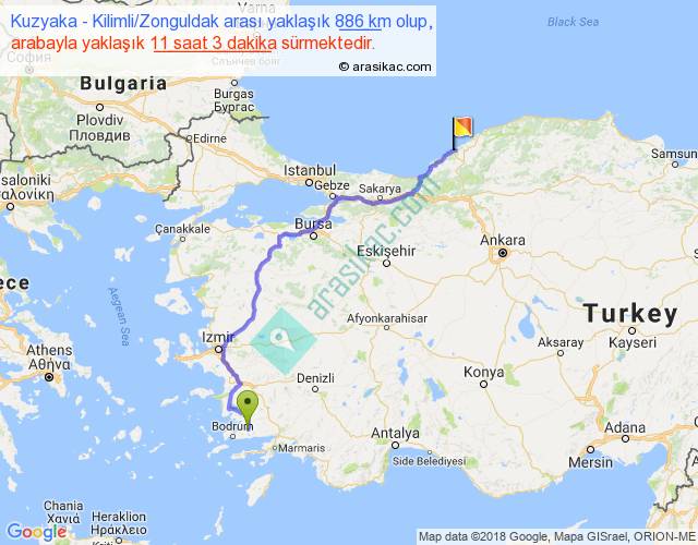 Kuzyaka - Kilimli Zonguldak arası yaklaşık olarak 90 km/h ile yukarıda belirtilen sürede olup, iki yerin kuş uçuşu uzaklığı (mesafesi) 599'dir. Eğer belirtilen yerler arasında uçak seferi var ise bu süre uçakla 55 dakika'ya kadar düşebilir. Yolculuk otobüsle 14 saat 21 dakika sürmektedir.