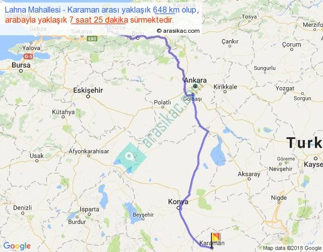 Lahna Mahallesi - Karaman arası yaklaşık olarak 90 km/h ile yukarıda belirtilen sürede olup, iki yerin kuş uçuşu uzaklığı (mesafesi) 465'dir. Eğer belirtilen yerler arasında uçak seferi var ise bu süre uçakla 42 dakika'ya kadar düşebilir. Yolculuk otobüsle 9 saat 38 dakika sürmektedir.