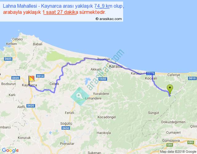 Lahna Mahallesi - Kaynarca arası yaklaşık olarak 90 km/h ile yukarıda belirtilen sürede olup, iki yerin kuş uçuşu uzaklığı (mesafesi) 52'dir. Yolculuk otobüsle 1 saat 53 dakika sürmektedir.