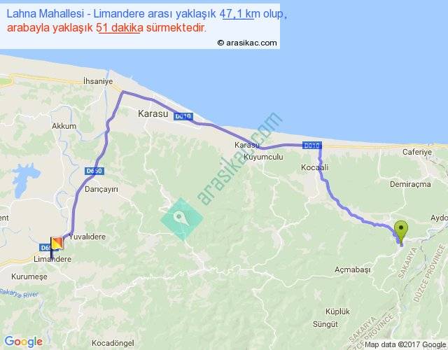 Lahna Mahallesi - Limandere arası yaklaşık olarak 90 km/h ile yukarıda belirtilen sürede olup, iki yerin kuş uçuşu uzaklığı (mesafesi) 29'dir. Yolculuk otobüsle 1 saat 6 dakika sürmektedir.