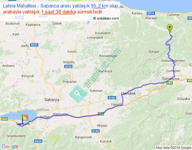 Lahna Mahallesi - Sapanca arası yaklaşık olarak 90 km/h ile yukarıda belirtilen sürede olup, iki yerin kuş uçuşu uzaklığı (mesafesi) 66'dir. Yolculuk otobüsle 2 saat 7 dakika sürmektedir.