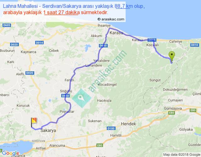 Lahna Mahallesi - Serdivan Sakarya arası yaklaşık olarak 90 km/h ile yukarıda belirtilen sürede olup, iki yerin kuş uçuşu uzaklığı (mesafesi) 56'dir. Yolculuk otobüsle 1 saat 53 dakika sürmektedir.