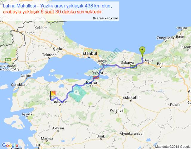 Lahna Mahallesi - Yazlık arası yaklaşık olarak 90 km/h ile yukarıda belirtilen sürede olup, iki yerin kuş uçuşu uzaklığı (mesafesi) 312'dir. Eğer belirtilen yerler arasında uçak seferi var ise bu süre uçakla 28 dakika'ya kadar düşebilir. Yolculuk otobüsle 7 saat 9 dakika sürmektedir.