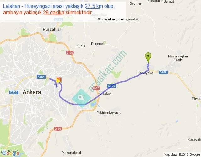 Lalahan - Hüseyingazi arası yaklaşık olarak 90 km/h ile yukarıda belirtilen sürede olup, iki yerin kuş uçuşu uzaklığı (mesafesi) 18'dir. Yolculuk otobüsle 36 dakika sürmektedir.