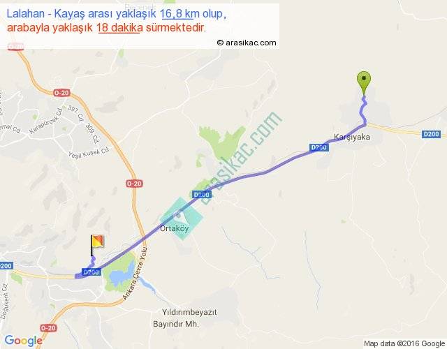 Lalahan - Kayaş arası yaklaşık olarak 90 km/h ile yukarıda belirtilen sürede olup, iki yerin kuş uçuşu uzaklığı (mesafesi) 13'dir. Yolculuk otobüsle 23 dakika sürmektedir.