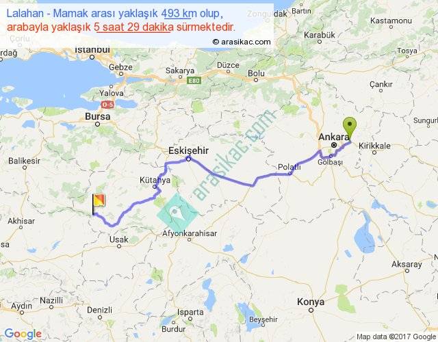 Lalahan - Mamak arası yaklaşık olarak 90 km/h ile yukarıda belirtilen sürede olup, iki yerin kuş uçuşu uzaklığı (mesafesi) 365'dir. Eğer belirtilen yerler arasında uçak seferi var ise bu süre uçakla 33 dakika'ya kadar düşebilir. Yolculuk otobüsle 7 saat 7 dakika sürmektedir.