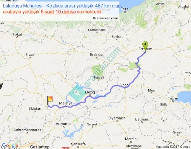 Lalapaşa Mahallesi - Kozluca arası yaklaşık olarak 90 km/h ile yukarıda belirtilen sürede olup, iki yerin kuş uçuşu uzaklığı (mesafesi) 350'dir. Eğer belirtilen yerler arasında uçak seferi var ise bu süre uçakla 32 dakika'ya kadar düşebilir. Yolculuk otobüsle 8 saat 1 dakika sürmektedir.