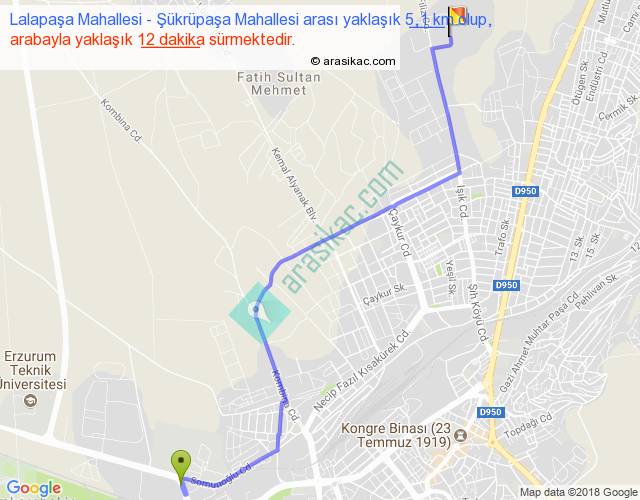 Lalapaşa Mahallesi - Şükrüpaşa Mahallesi arası yaklaşık olarak 90 km/h ile yukarıda belirtilen sürede olup, iki yerin kuş uçuşu uzaklığı (mesafesi) 4'dir. Yolculuk otobüsle 15 dakika sürmektedir.