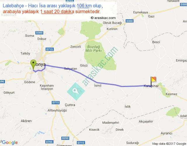 Lalebahçe - Hacı İsa arası yaklaşık olarak 90 km/h ile yukarıda belirtilen sürede olup, iki yerin kuş uçuşu uzaklığı (mesafesi) 98'dir. Yolculuk otobüsle 1 saat 44 dakika sürmektedir.