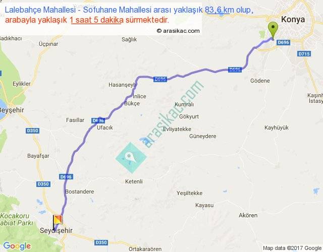 Lalebahçe Mahallesi - Sofuhane Mahallesi arası yaklaşık olarak 90 km/h ile yukarıda belirtilen sürede olup, iki yerin kuş uçuşu uzaklığı (mesafesi) 69'dir. Yolculuk otobüsle 1 saat 24 dakika sürmektedir.